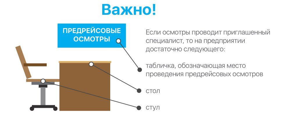- В зависимости от объема работы и числа сотрудников осмотры могут проводиться в кабинете, медпункте или медчасти.