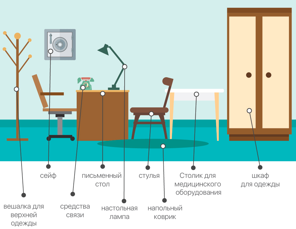 - Оборудование: обязательны кушетка, офисная мебель, телефон, осветительные приборы.