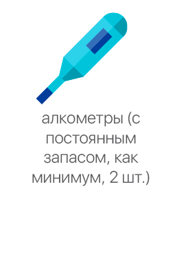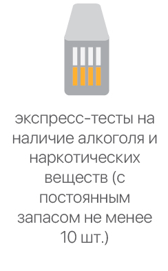 - медоборудование: кушетка, столы, стулья, фонендоскопы, термометры, алкотестеры, шпатели, медикаменты для неотложной помощи;