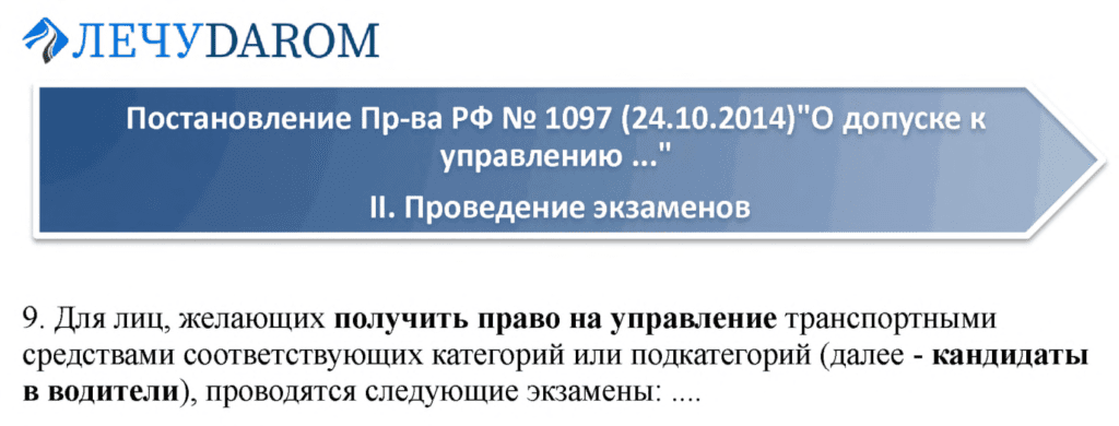 Поэтому требовать от транспортной компании контролировать регулярность медосвидетельствований — грубейшая ошибка. Данный норматив относится к вышеупомянутому случаю (экзамену), а не к работе водителя профессионала (автолюбителя). В целях обеспечения БДД кандидаты на получение прав обязаны предоставить Справку для ГИБДД и все! В подтверждение этих слов можно привести 9 пункт ПП №1097.
