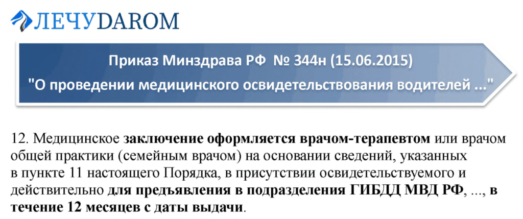 - Приказ Минздрава №344н (15/06-15 г.) — Порядок медосвидетельствования для водительских прав.