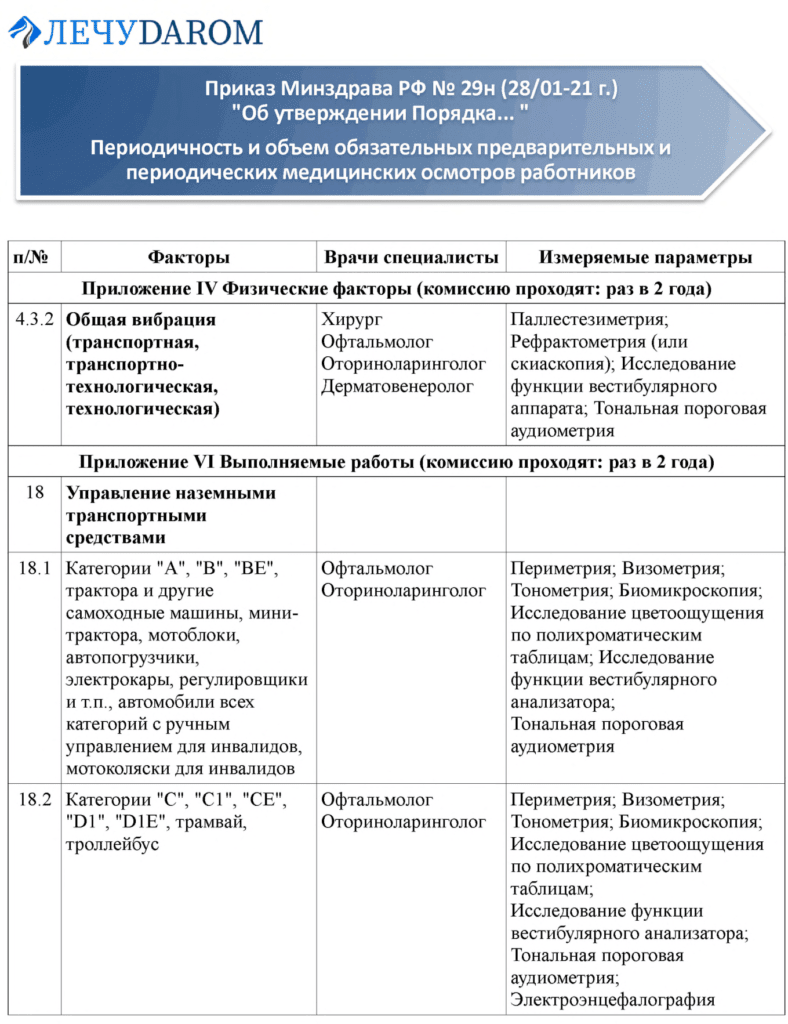 - В рамках ч. 4; ст. 213 ТК РФ: ПМ №29н (28/01-21 г.) — Порядок предварительного и периодического медицинского осмотра (медкомиссия) водителей и претендентов.