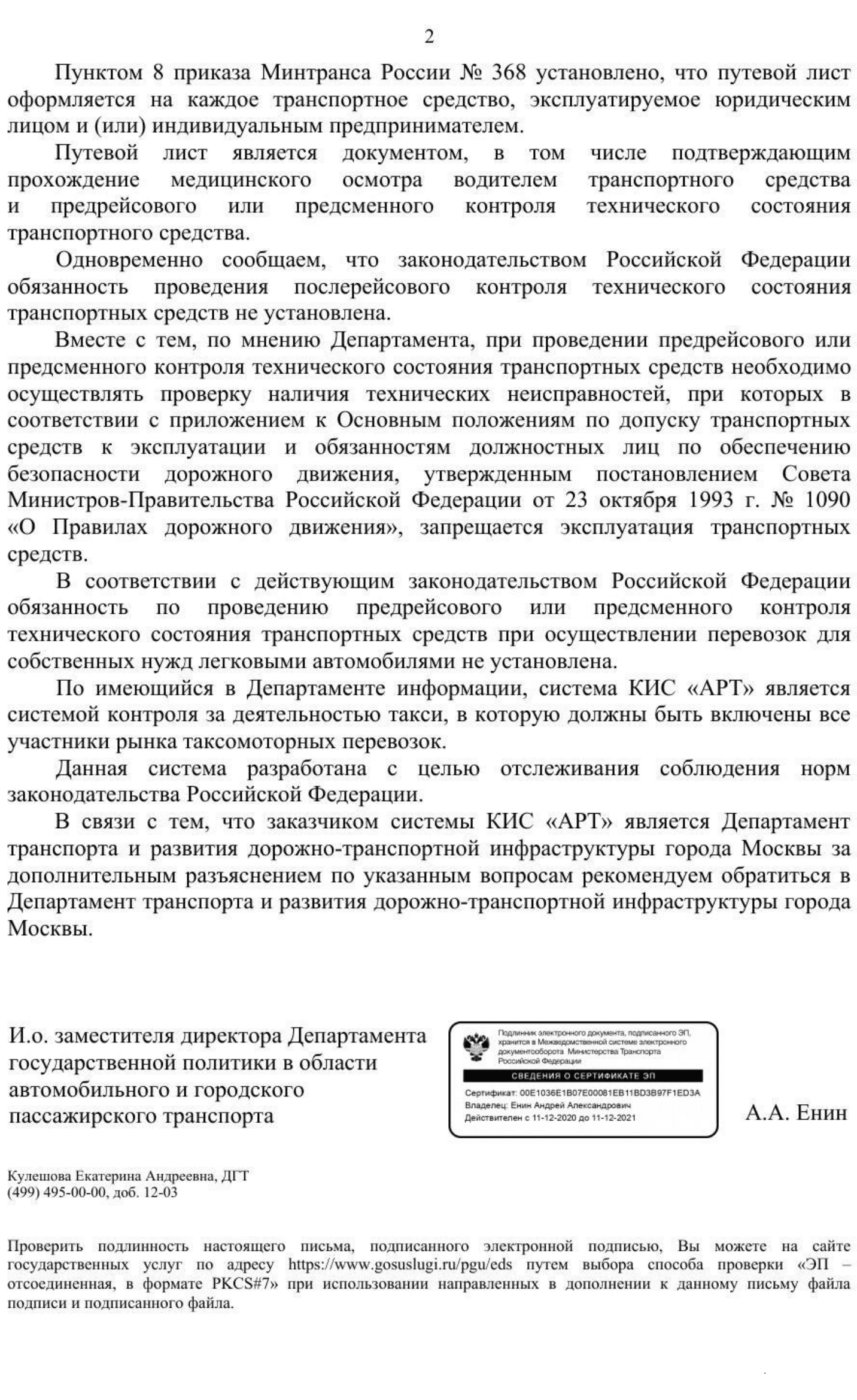 Заказчиком проекта КИС «АРТ» является Департамент транспорта и развития ДТИ Москвы. Кроме того, что в систему контроля за перевозчиками пассажиров в сфере ТАКСИ, работающих в столице, должны быть включены все таксопарки, чтобы осуществлялся надзор за их деятельностью и соблюдением нормативных требований, МТ РФ ничего добавить не может в силу своей некомпетентности. Поэтому рекомендует за разъяснениями обращаться к Заказчику КИС «АРТ». Письмо подписано и.о. замдиректора Департамента А.А. Ениным.