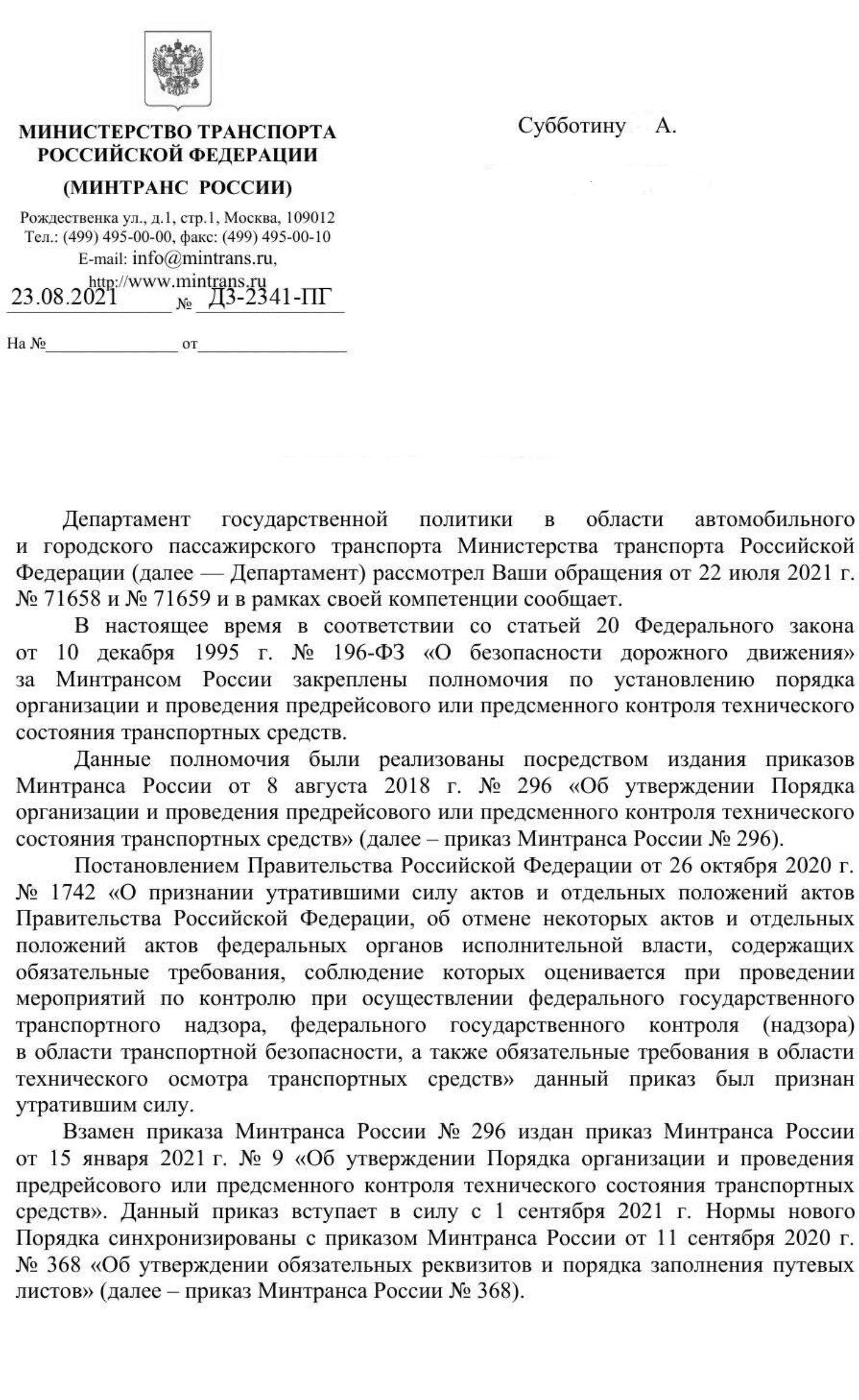 Главное в письме Минтранса России от 2021 года : послерейсовый технический контроль транспортных средств законодательством РФ не предусмотрен.
