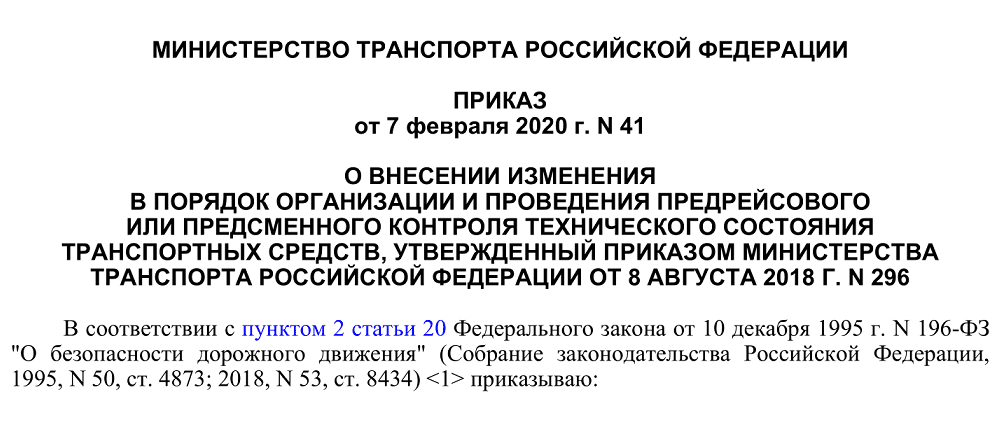 Комментарий: Раньше все автотранспортные средства, принадлежащие юридическому лицу, ИП, в том числе, такси, обязаны были проходить предрейсовый контроль технического состояния до начала движения. Не имела значения цель поездки: коммерческая или личная. После выхода этого приказа техосмотр легкового авто, используемого для перевозки материальных объектов для собственных нужд не требуется. Для автобусов и грузового автомобиля все остается по-прежнему.