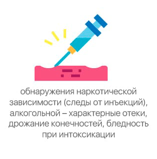 • обнаружения наркотической зависимости (следы от инъекций), алкогольной – характерные отеки, дрожание конечностей, бледность при токсикации;