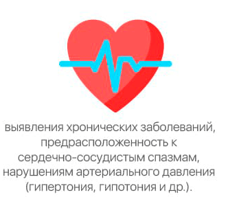 • выявления хронических заболеваний, предрасположенность к сердечно-сосудистым спазмам, нарушениям артериального давления (гипертония, гипотония и др.).