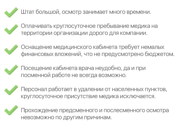 Если цель осмотра – контроль за состоянием сотрудников в разное время суток при посменной работе, когда штатного медперсонала нет, или обеспечение круглосуточного дежурства дорого для организации, то переход на дистанционное обслуживание – разумное и выгодное решение.