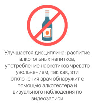 5. Улучшается дисциплина: распитие алкогольных напитков, употребление наркотиков чревато увольнением, так как, эти отклонения врач обнаружит с помощью алкотестера и визуального наблюдения по видеозаписи. 6. Доступность процедуры в любое время дня и ночи.