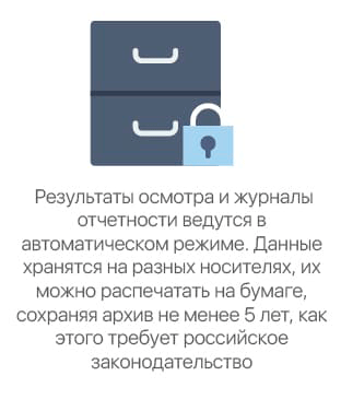 7. Результаты осмотра и журналы отчетности ведутся в автоматическом режиме. Данные хранятся на разных носителях, их можно распечатать на бумаге, сохраняя архив не менее 5 лет, как этого требует российское законодательство.