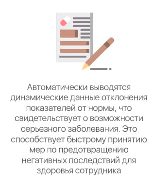 8. Автоматически выводятся динамические данные отклонения показателей от нормы, что свидетельствует о возможности серьезного заболевания. Это способствует быстрому принятию мер по предотвращению негативных последствий для здоровья сотрудника.