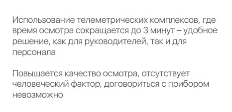 Поэтому использование телеметрических комплексов, где время осмотра сокращается до 3 минут – удобное решение, как для руководителей, так и для персонала. К тому же повышается качество осмотра, так как, отсутствует человеческий фактор, договориться с прибором невозможно. Решение об удаленной процедуре, с использованием телеметрического медоборудования, зависит от целей медосмотра.