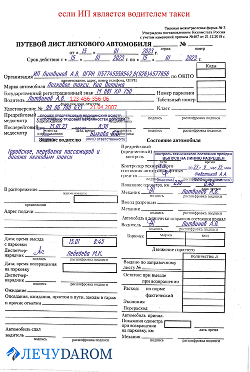 - Путевой лист для ИП: ИП Лемешев И.Н., ОГРН, телефон. (юр. адрес не нужен)