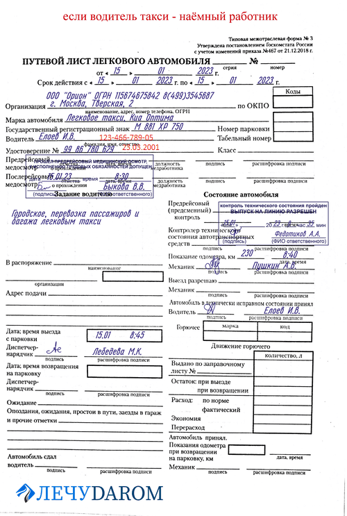 - Путевой лист физ.лицо: Лемешев И.Н., г Москва, ул. Причестенка, д.3, кв.6, телефон, СНИЛС (даже если водитель иностранец)