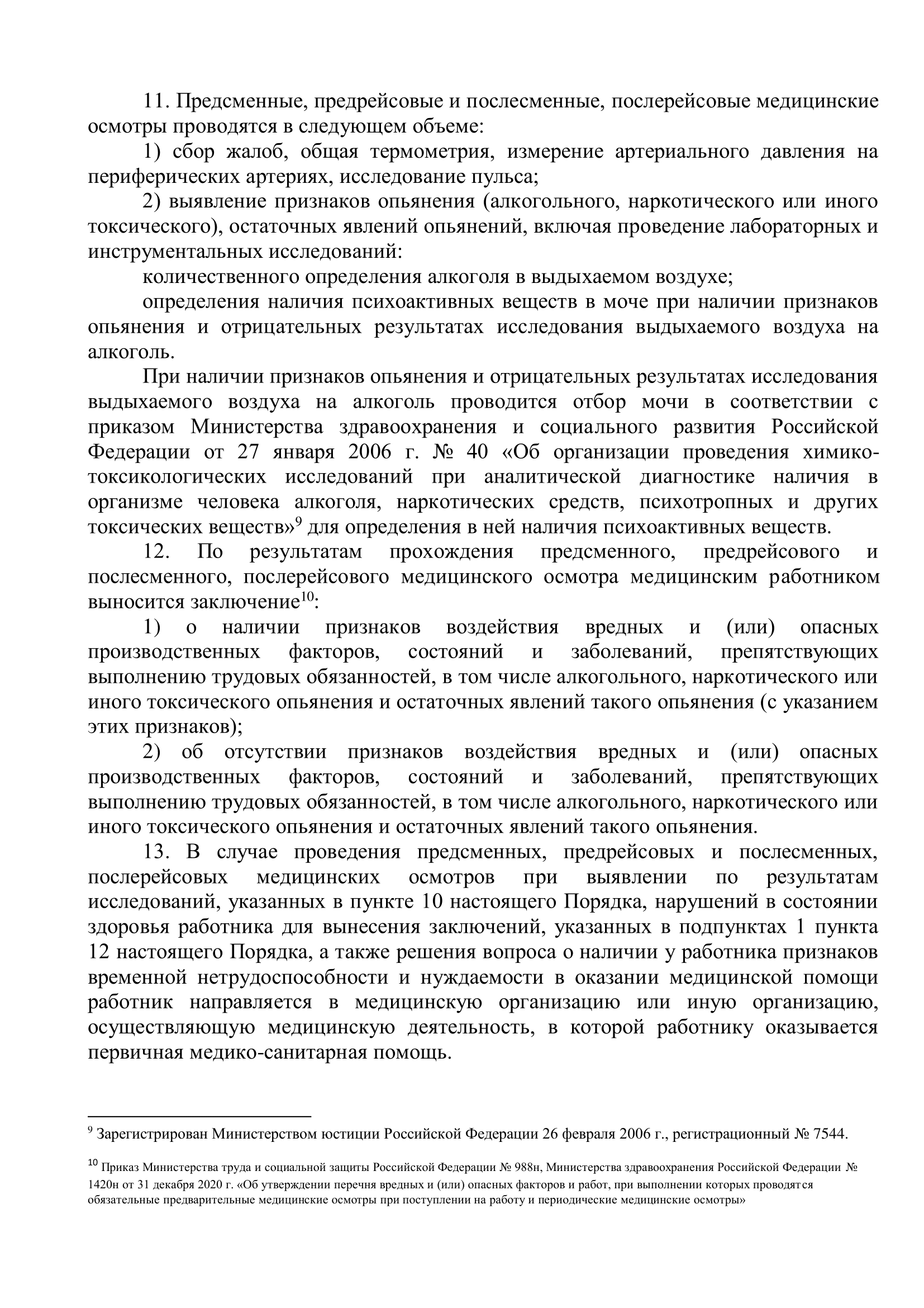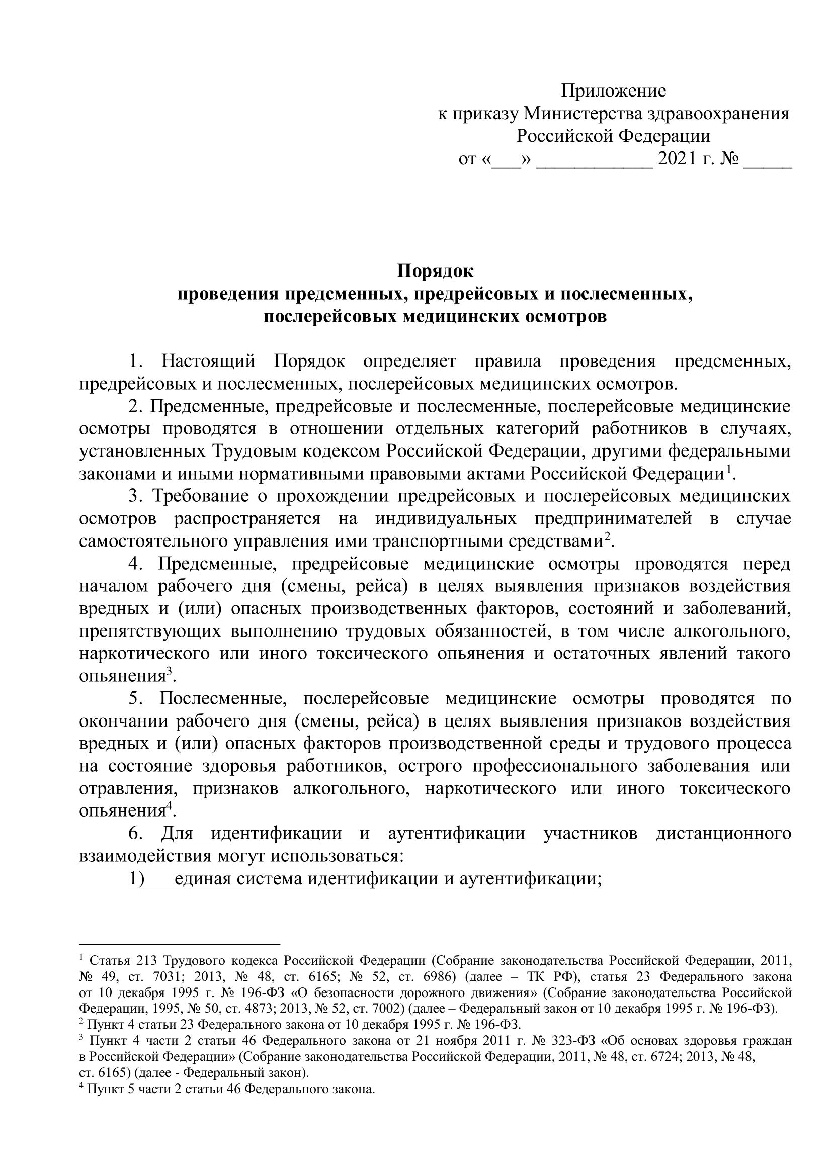 Медосмотры проводятся в начале дня: перед рейсом или сменой. С целью выявления факторов, не позволяющих управлять автотранспортом, включая алкогольное, наркотическое, токсическое опьянение. Аналогичную цель и действие трудового процесса на состояние здоровья преследуют послерейсовые (в конце смены) медосмотры водителей (пп. 5 и 4 Приложения).