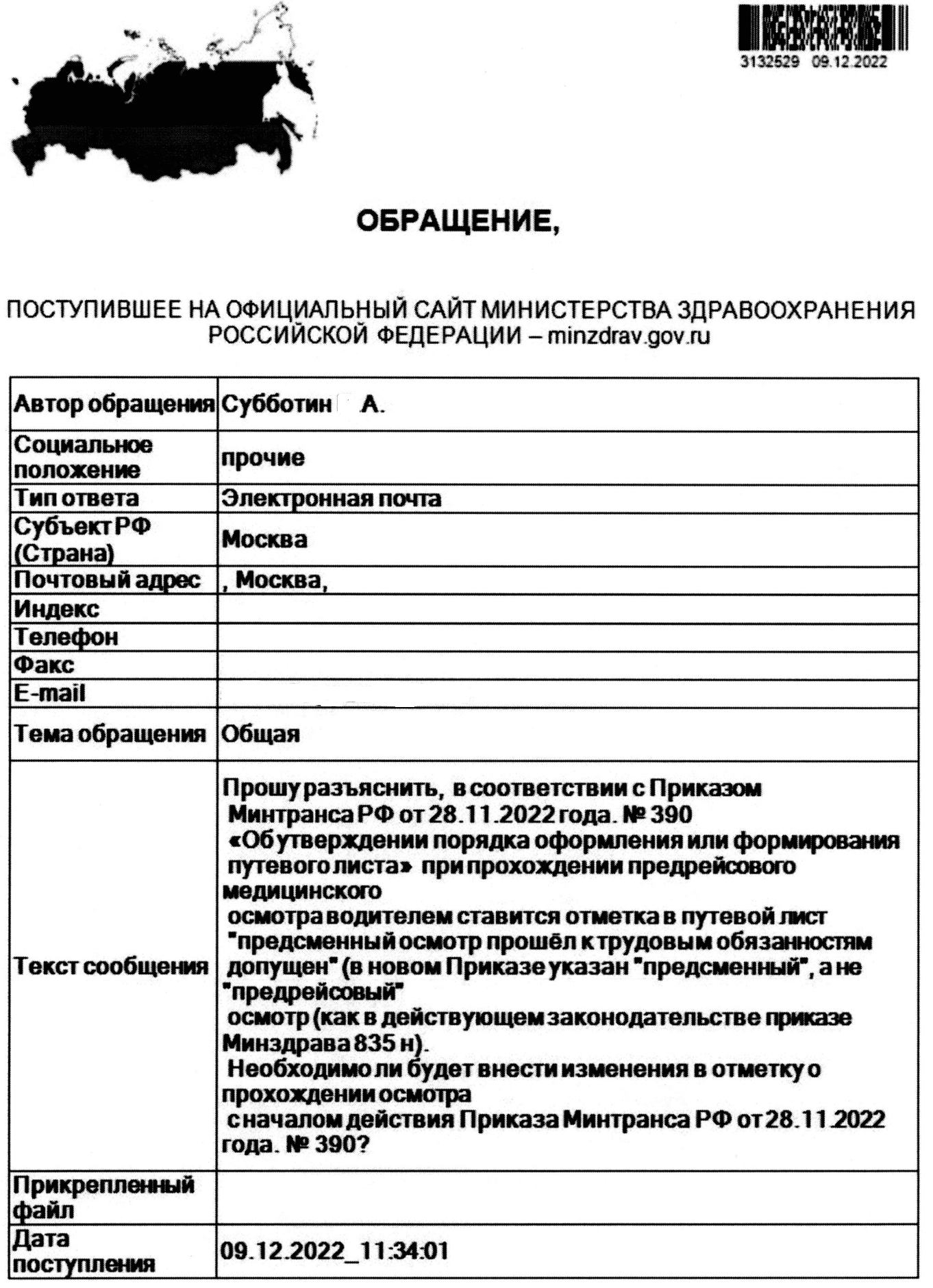 В ответе от Министерства здравоохранения дополнительно содержались рекомендации руководствоваться Федеральным законом №323 от 21 ноября 2011 года при медицинском контроле перед началом рейса. Сам закон при этом не содержит сведений о том, какие отметки ставить в путевой лист после прохождения осмотра. Далее представитель Минздрава отметил, что вопрос в отношении оформления путевых листов передан в Минтранс.