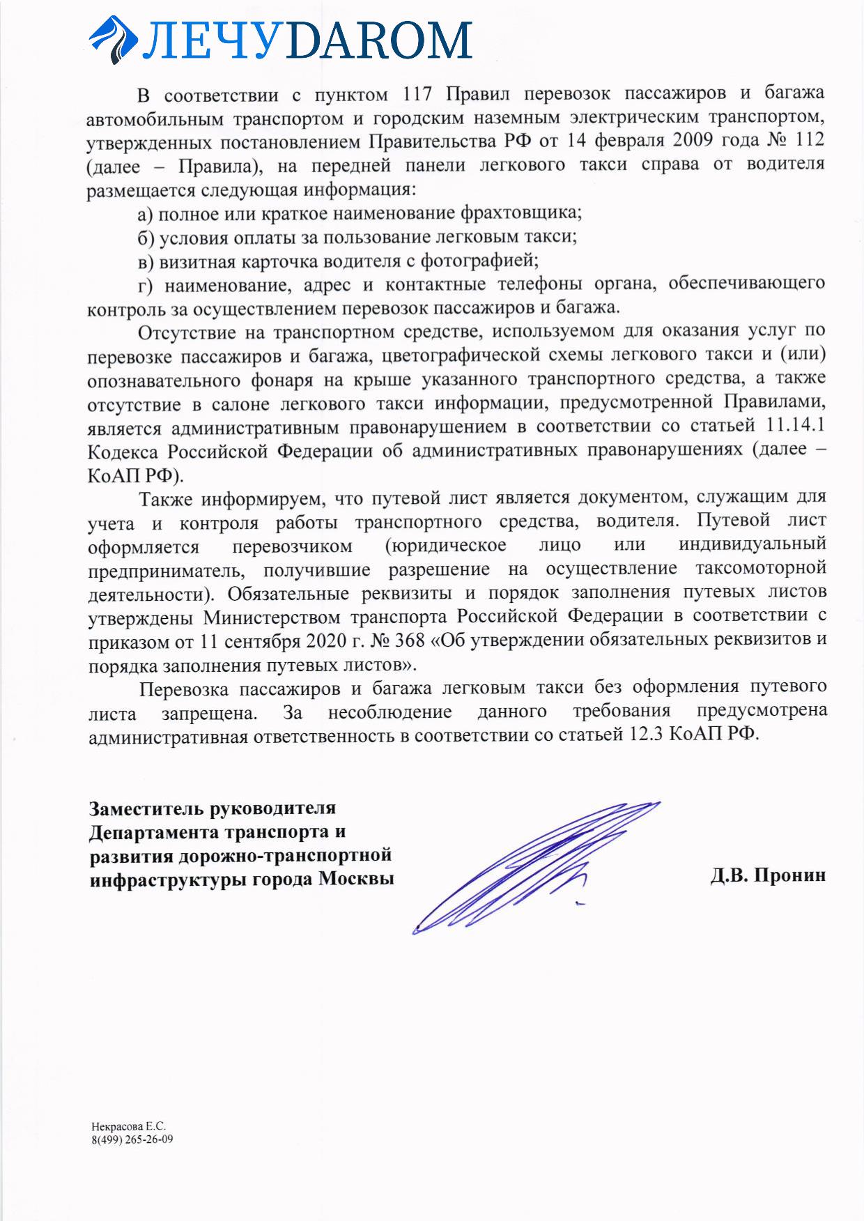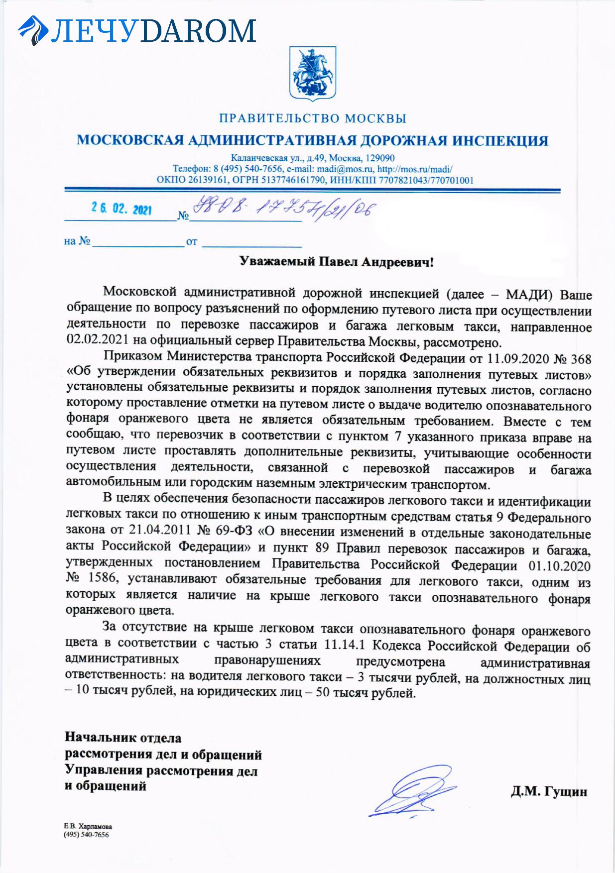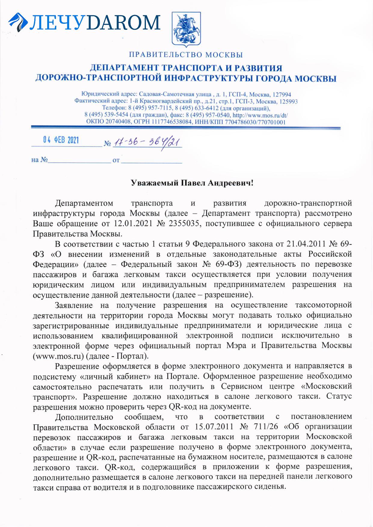 В письме Правительства Москвы Департамента транспорта и развития дорожно-транспортной инфраструктуры города Москвы от 04 февраля 2021 года № 17-364/21.