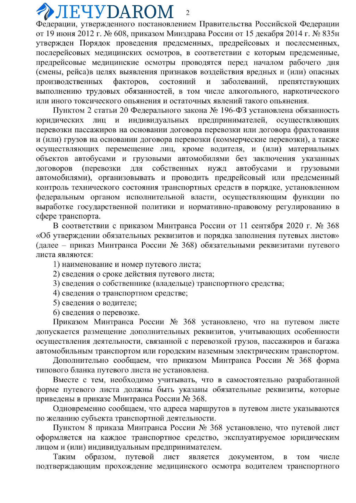 - Так же путевой лист оформляется на каждое транспортное средство согласно статьи 8 приказа №368.