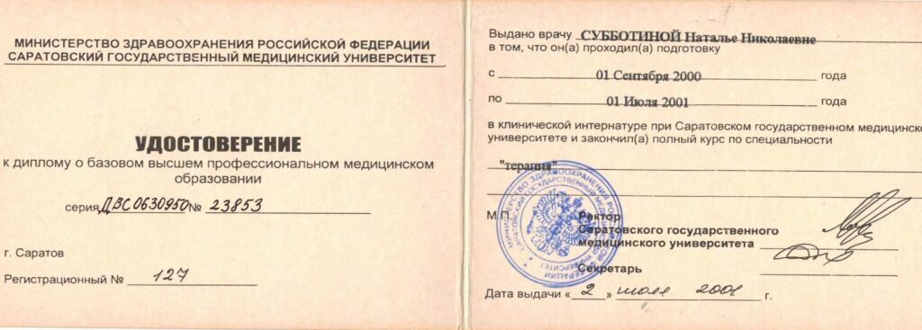 Интернатура по терапии при Саратовском Государственном Медицинском Университете в 2001 году.