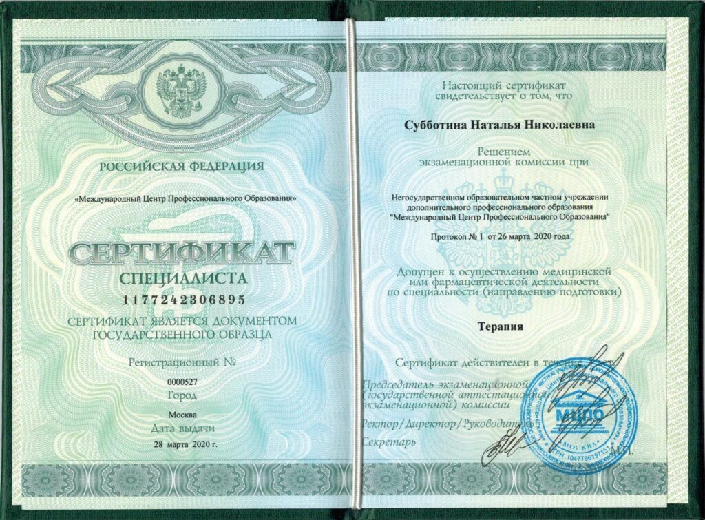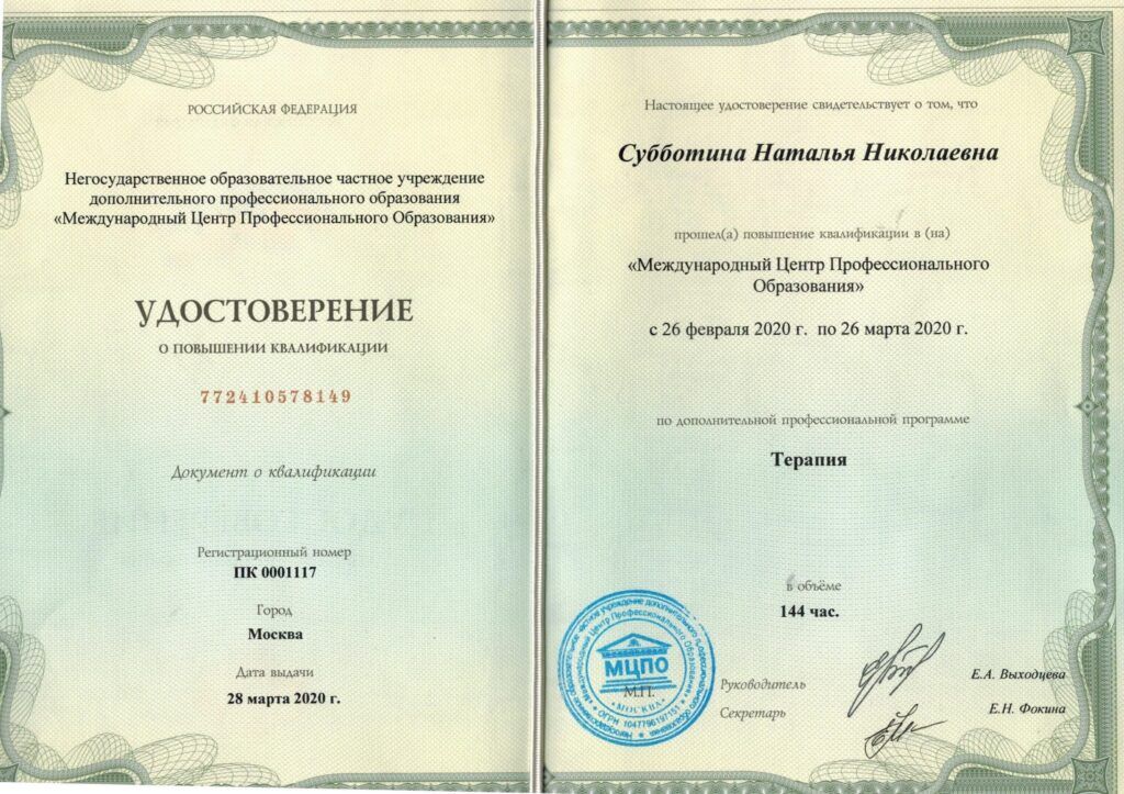 Субботина Наталья Николаевна врач-терапевт высшей квалификационной категории, заведующая терапевтическим отделением клинико-диагностического центра «ЛЕЧУДАРОМ».